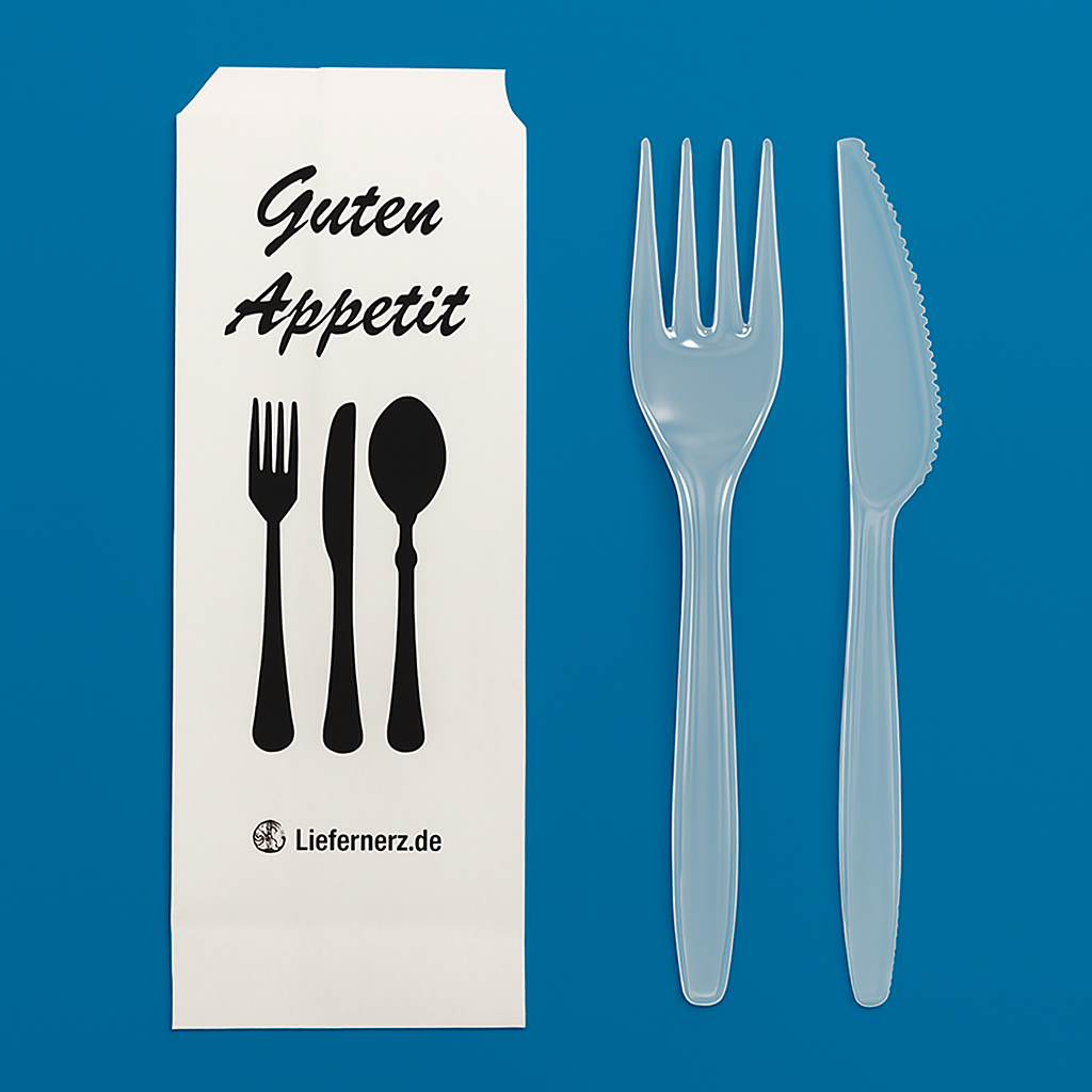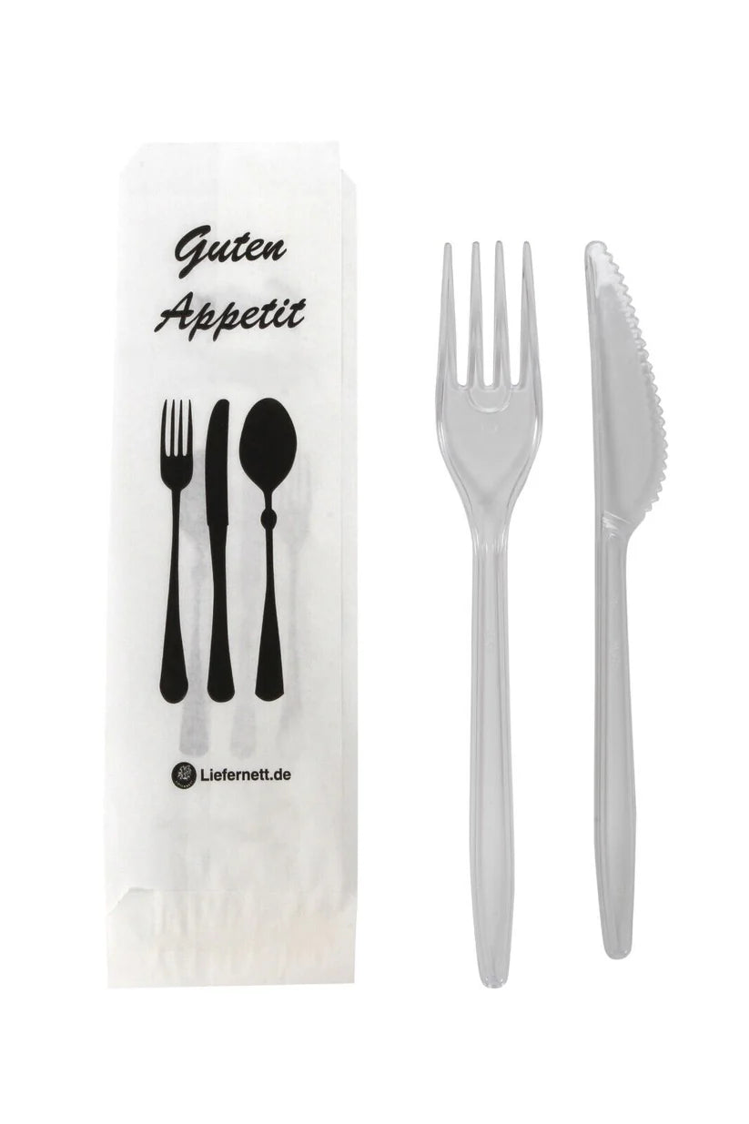 50er Mehrwegbesteck Set 3 in 1: Gabeln, Messer, Serviette einzeln verpackt