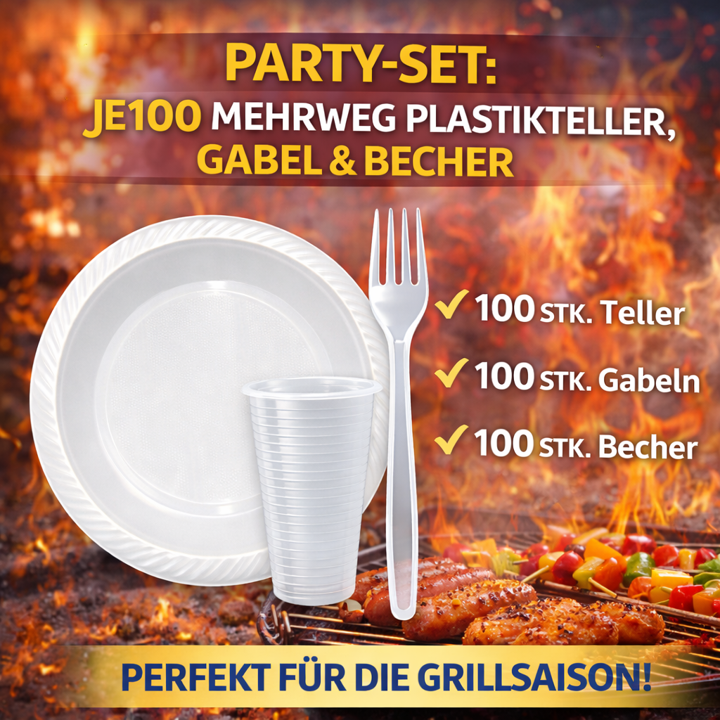Party SET: Je 100 mehrweg Plastikteller,Gabel,Becher 🚚 Versand mit GLS: 5,90 € deutschlandweit